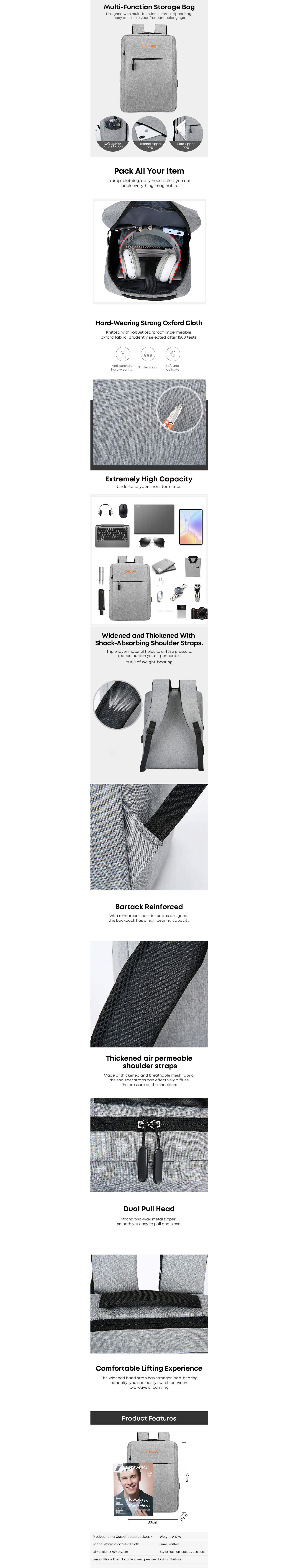 Chuwi Backpack Waterproof Oxford Cloth | USB Connector Design | Dual Pull Head